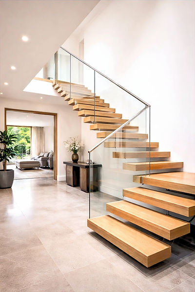 MK Metals Ltd designed, fabricated, and installed a bespoke floating staircase with frameless glass balustrades for a private residential home. Conceived as a central architectural feature, the staircase combines concealed structural steelwork with precision detailing to achieve a clean, minimalist floating appearance.